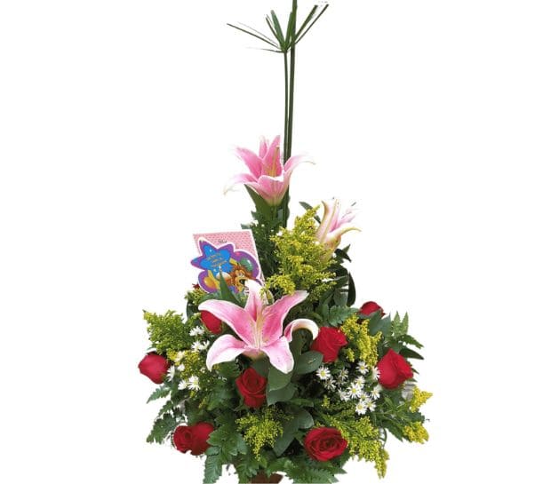 Categor铆as: arreglo en base, dia de la madre, Dia de la madre, Lirios, rosa, rosas, 馃巵Detalle, 馃巶 cumplea帽os, 馃拪Recuperate pronto