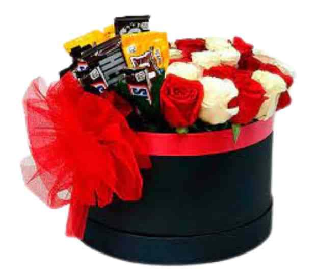 Un moderno arreglo en caja redonda, destacandolos diferentes dulces y sus rosas de color rojo y blancas.