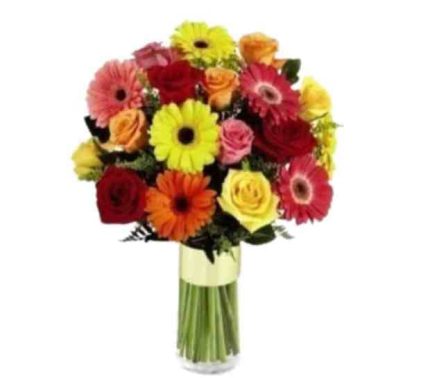 Radiante florero que contiene 12 rosas surtidas 12 gerberas surtidas