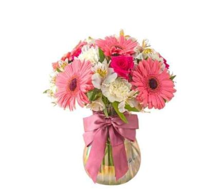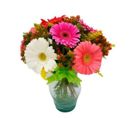 Tierno florero que contiene 6 gerberas 6 rosas pinoquios astromelias